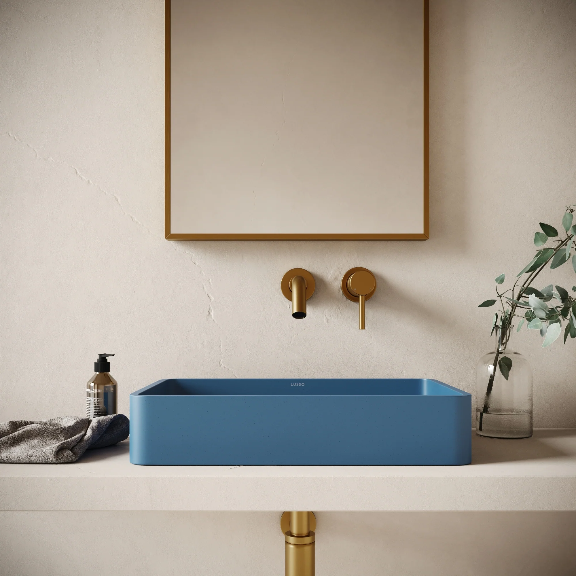 The Arquadro concrete basin by Lusso combines arched corners with a perfectly proportioned square silhouette. Its sleek countertop design brings a modern sense of elegance to any bathroom. Shown in Azure, a striking blue, inspired by summers well spent in the South of France, where the rolling waves meet the vivid blue sky.