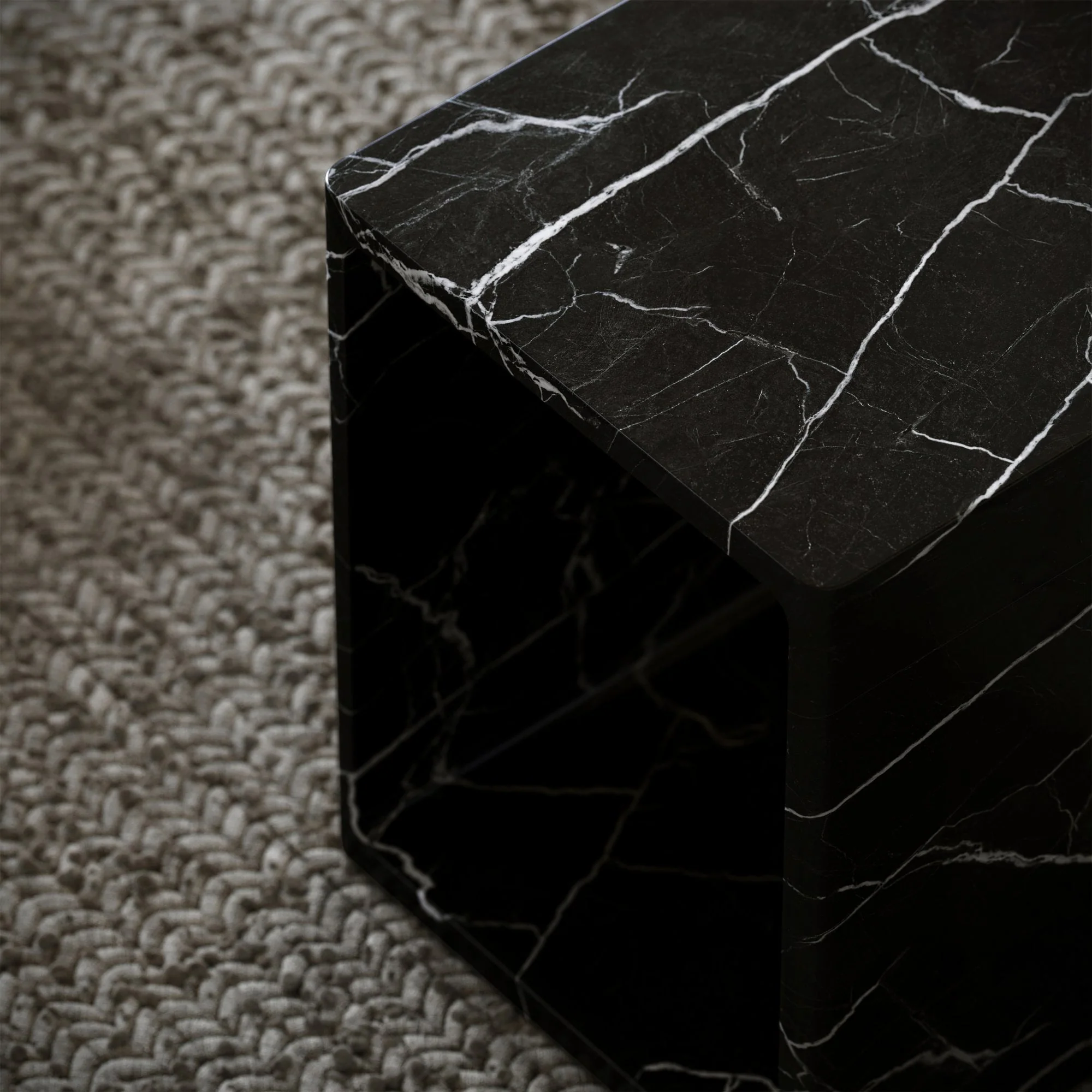 Perfect for living spaces or bedrooms, the table boasts a square silhouette with angular corners. Crafted from a solid block of Spanish Nero Marquina marble that is defined by its striking black surface and white traversing swathes.