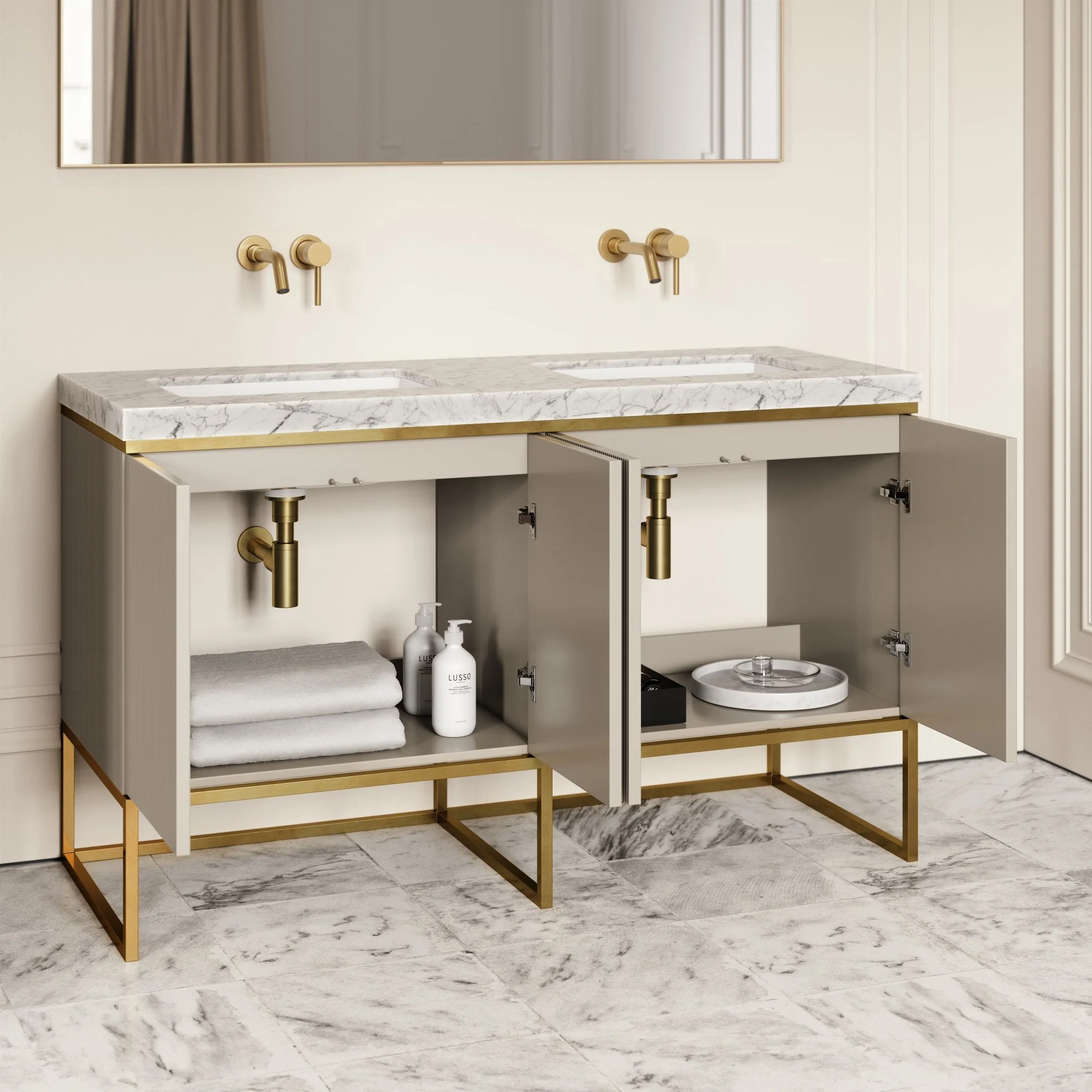 The double vanity unit opens up to two internal compartments, great for storing essentials such as hand towels, soaps and self-care items, making it the perfect piece for residential family bathrooms or commercial hotel suites. Finished with a beautiful velvet beige coating in a soft matte finish, the freestanding vanity unit is the perfect option for those seeking a taste of grandeur in the home. As a testament to its quality, the Couture vanity unit comes with a 7 year guarantee.