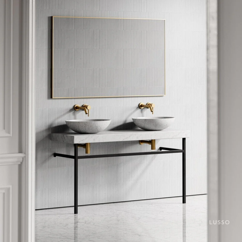 The Lomazzo Countertop Vanity Unit is defined by its beautiful Carrara marble and opulent brushed gold framework which seamlessly blends as an extravagance piece for your bathroom.