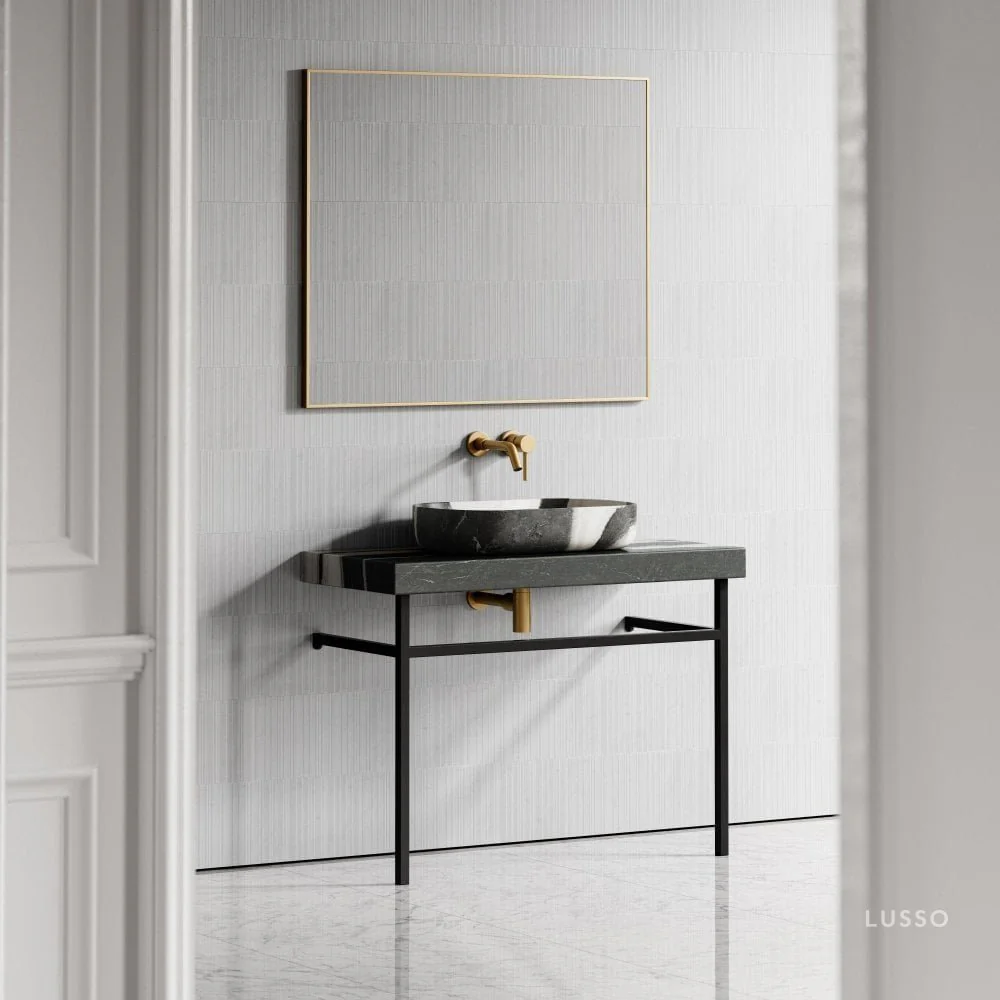 At 1000 mm wide, the vanity unit displays the beautiful monochrome swathes of the Panda marble which works exceptionally well with the brushed gold framing. The vanity unit is perfect for styling with a Panda marble countertop basin and Porto Panda taps, both part of the exclusive Lusso range.