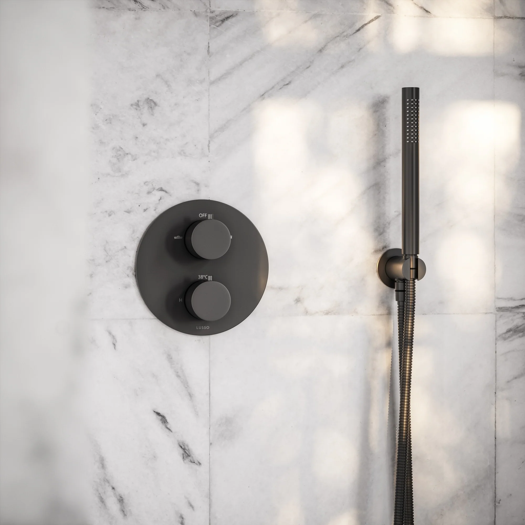 The Lusso Thermostatic Shower With Handheld Shower Matte Black has all the characteristics of a luxurious, beautiful bathroom design. With a sophisticated feel and commercial-grade components, this shower offers precision temperature control and a modern, simplistic look in your bathroom.