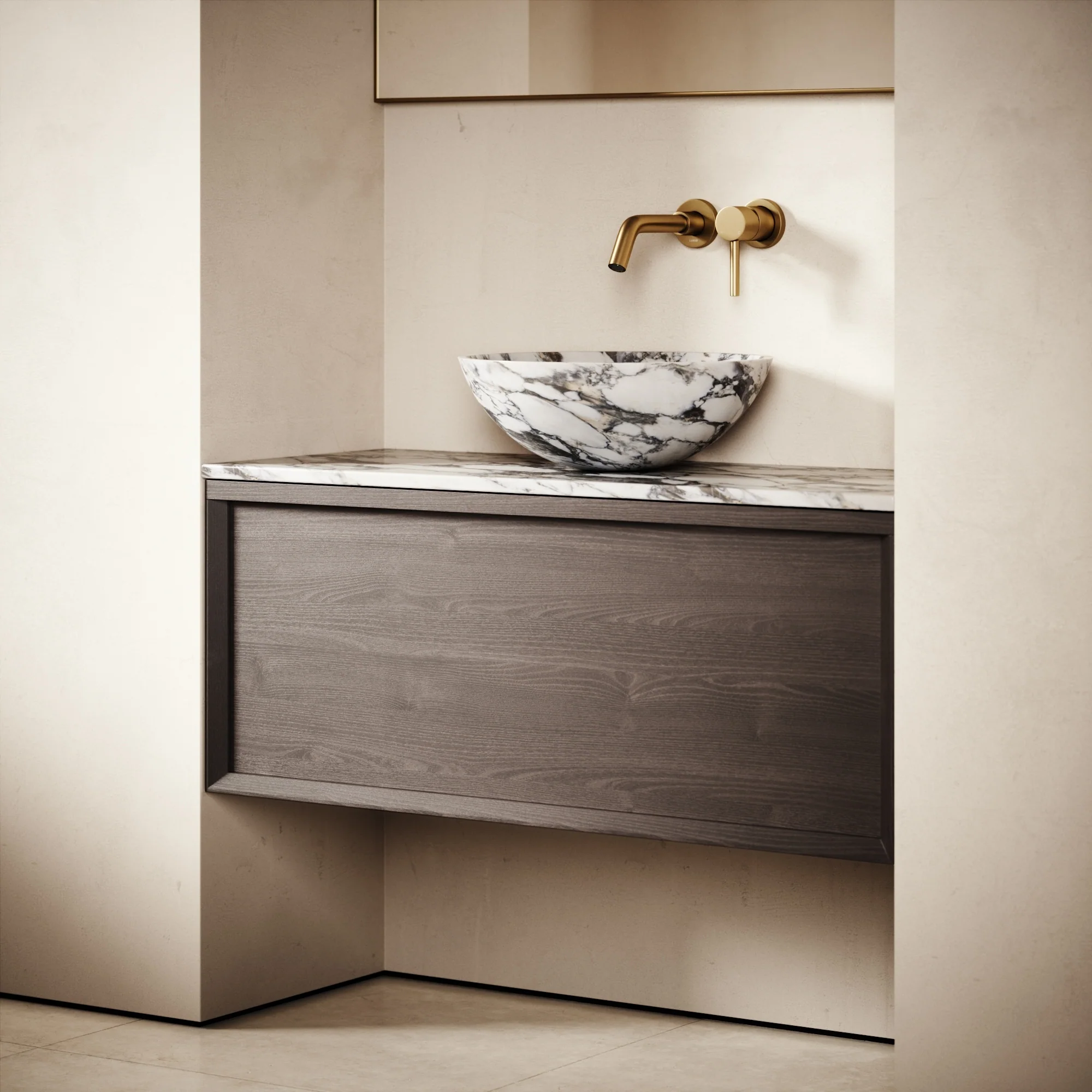 The Palermo vanity unit defines timeless luxury, with an expert-grade wood unit and a choice of a marble countertop in Arabescato, Carrara and Pietra Grey.