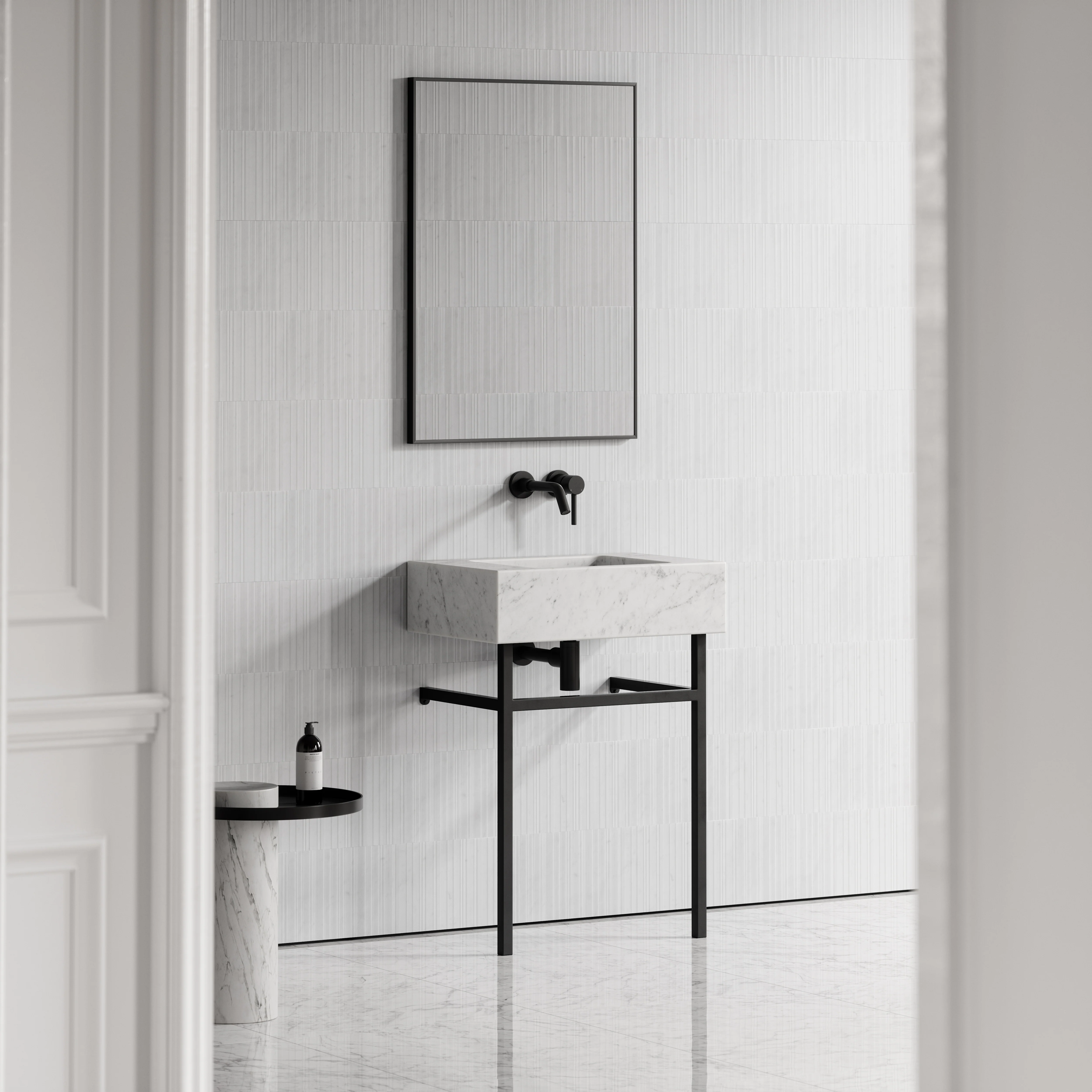 An indulgent expanse of solid marble creates this captivating basin floating serenely a-top its sleek black legs. Flaunting an effortless silhouette, the Vernante has a weightless appeal thanks to its slender stainless steel frame.