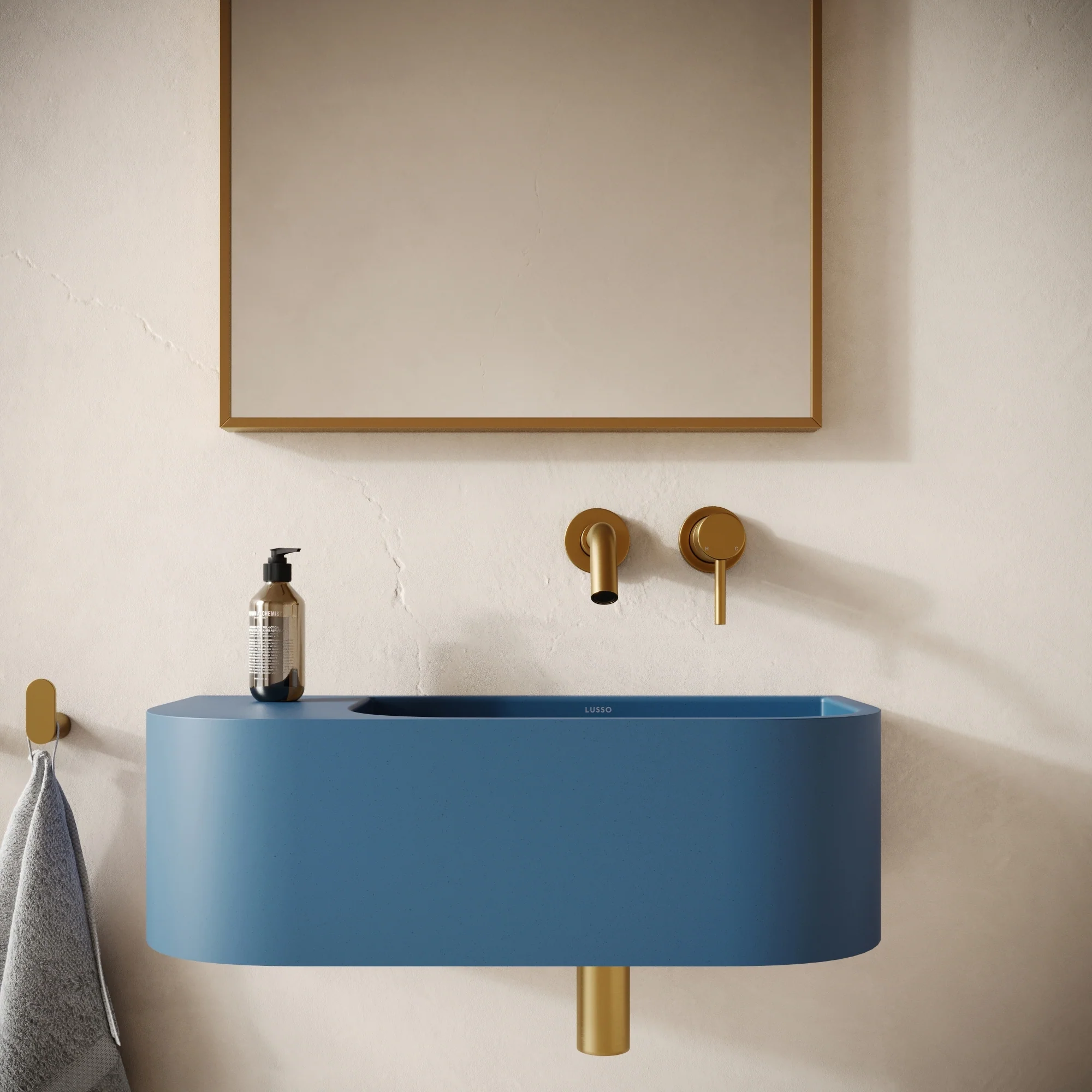 Handcrafted from smooth aggregate-based concrete, the Voluto basin displays curvaceous edging, a generous basin bowl and is designed for wall mounted installation. Shown in Azure, a striking blue, inspired by summers well spent in the South of France, where the rolling waves meet the vivid blue sky. Style with our matte white taps and accessories to create a distinctive and contrasting style.